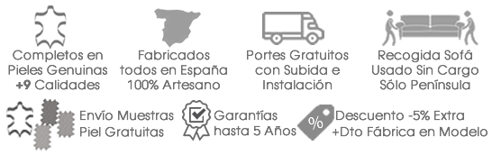 Principalmente tu compra de cualquier modelo de nuestra fabricación es completo y 100% piel-piel, muchos te dicen que sus sofás en algunas partes llevan y son pieles "ecológicas y se cuida el medio ambiente" y no es cierto, esas partes, normalmente los laterales y traseras de los sofás son de Plástico é Incluso Pieles Duras de Baja Calidad, con esto solo se consigue mejorar el precio engañando al consumidor, pero se cuidan de explicarlo para que lo sepas y no reclames después con el paso de los años, pero eso no es todo, te dicen también fabricación nacional, sin embargo son de origen asiático. (Chinos) y de Polonia, conllevando un problema añadido de servicio técnico y continuidad en problemas que pueden surgir en las entregas.