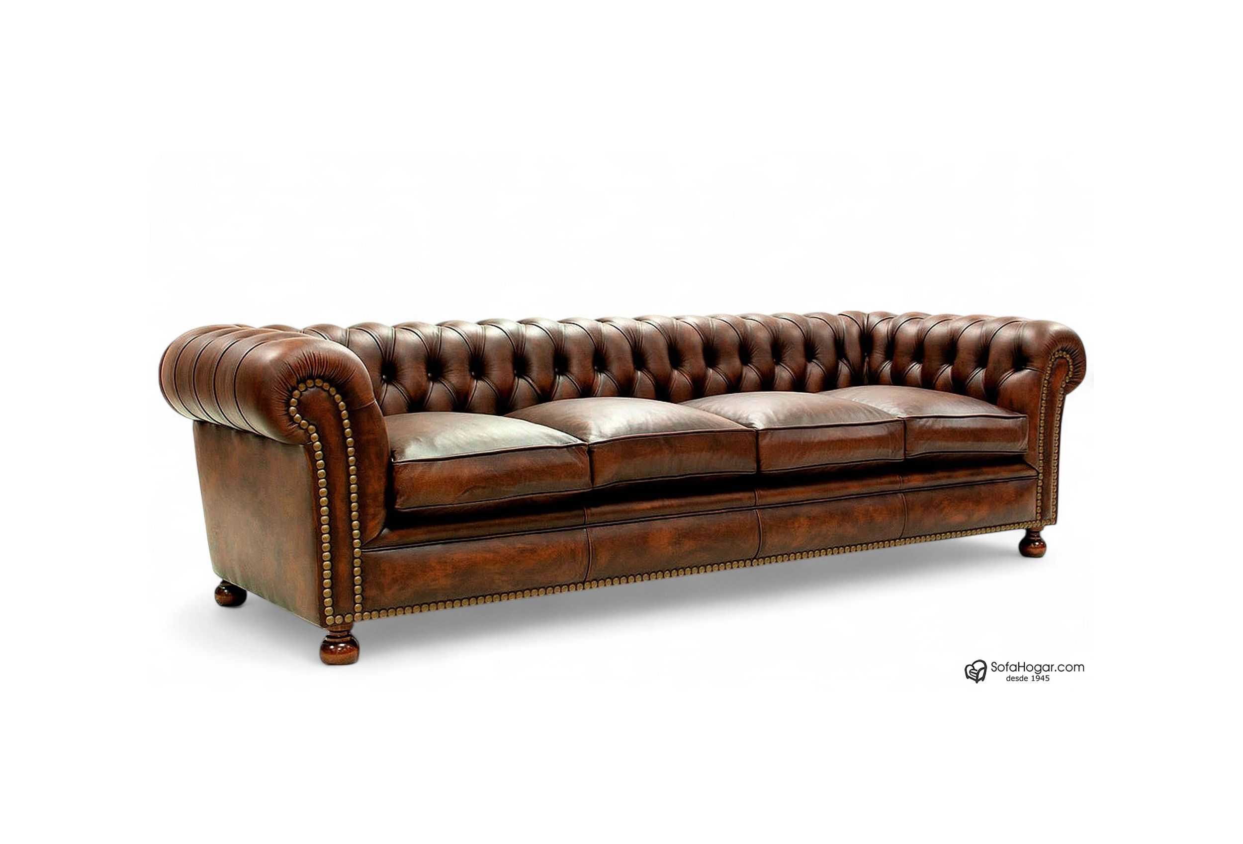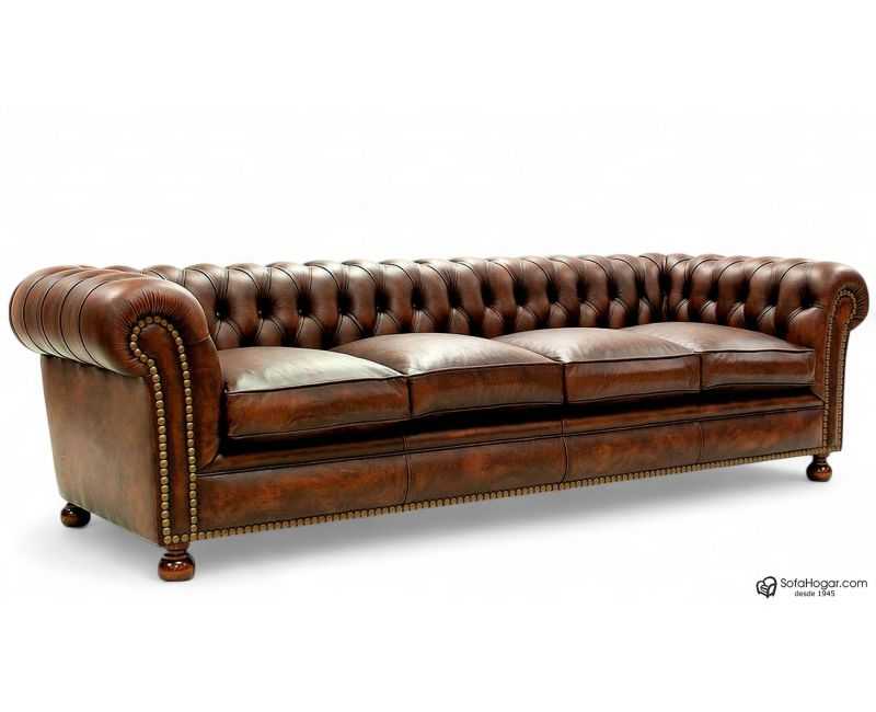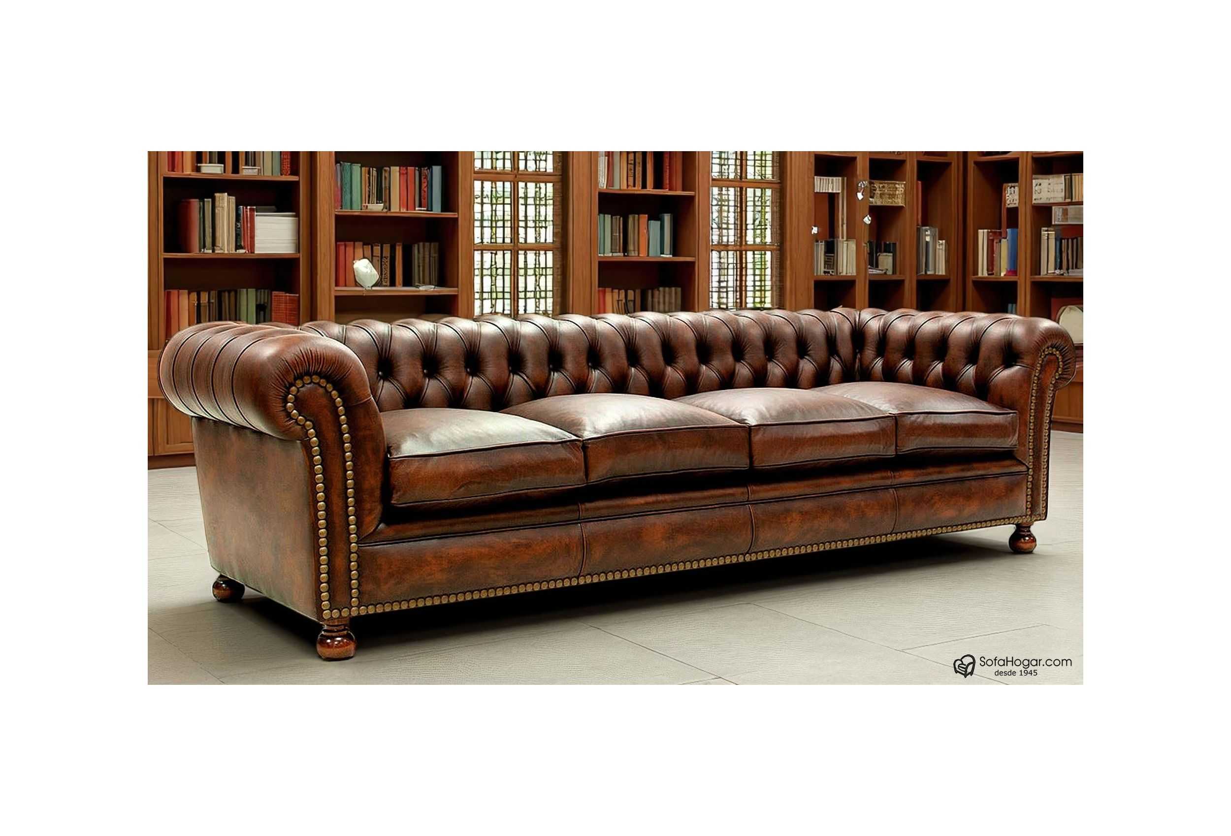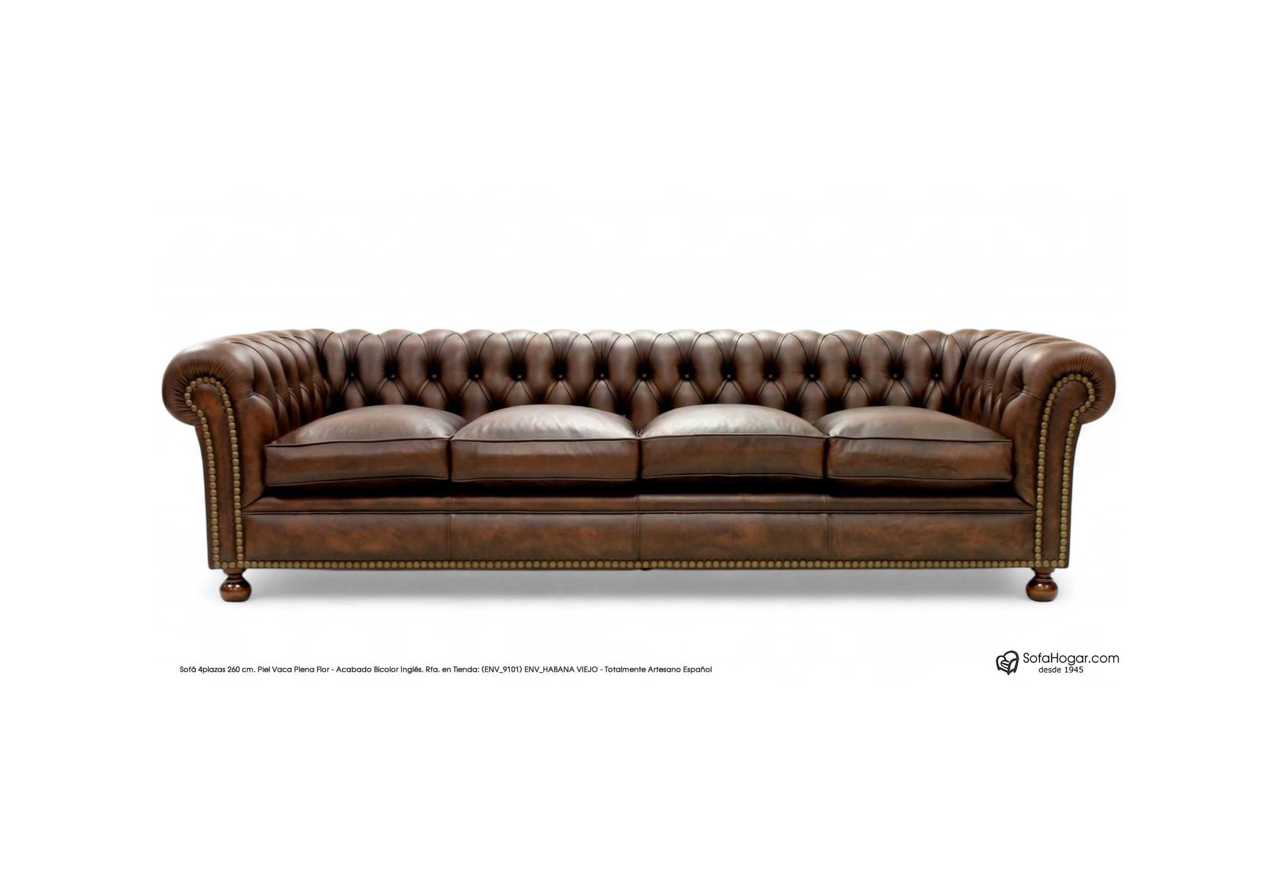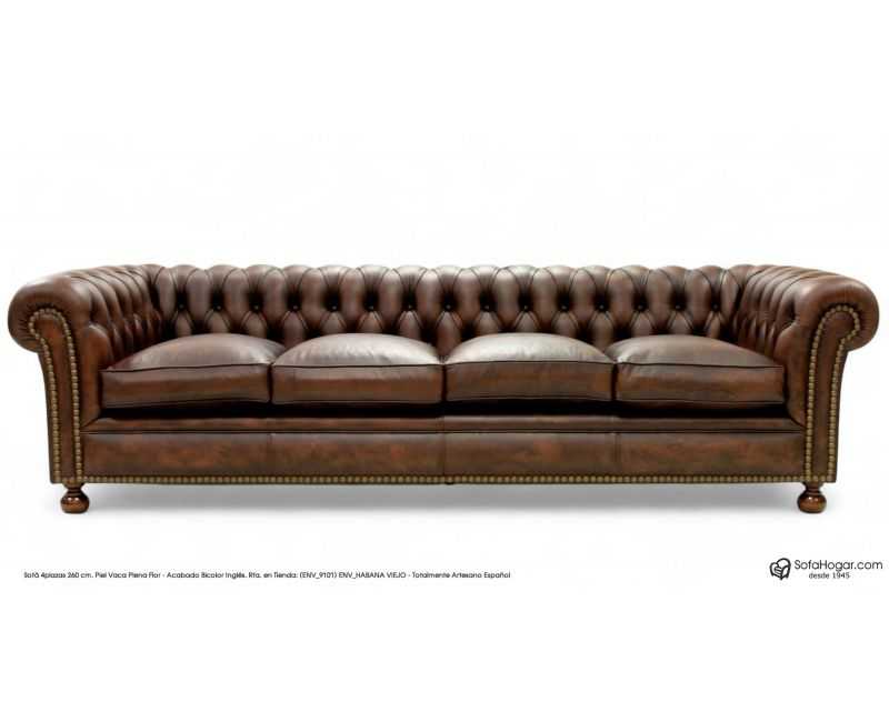 CARACTERÍSTICAS DE PRESENTACIÓN EN TIENDA: Sofá 4 plazas de 260 cms, tapizado en piel de vaca natural 100% por todo el conjunto de la pieza, color vintage Inglés color Habana viejo rfa. (ENV_9101) ENV_HABANA VIEJO, podemos fabricarlo en otros tonos de vintage no presentados aquí, suspensión de muelles helicoidales de acero 3,8 mm anclados a estructura uno a uno, totalmente artesanal, estructura de maderas combinadas pino, haya, chopo, y roble, encoladas con montaje artesanal carpintero, capitoné artesanal realizado de forma tradicional no cosido, realizado uno a uno como todo buen sofá Chesterfield, guarnecidos internos manuales mediante crin de coco vegetal y con acabados de polieter - latex alta calidad, pretapizado interno con telas aragonesas crudas, previo a la incorporación de la piel exterior final, lo que garantiza una vida larga del sistema de capitoné, pretapizados con loneta aragonesa en las zonas de suspensión muelles, zona de copetes, zonas laterales con pretapizado de cartones antihumedad y polieter de alta gama previo a la piel, frentes elásticos con previos de polieter latex, botoneado con fornituras de botón con anclaje de hilo de nylón encerado anclado a estructura, lo que garantiza la seguridad del botón por mucho tiempo, almohadones de asiento con interior rellenos de Plumón de Oca y con pre-funda popelín anti-salida de pluma con cremallera tanto la funda interior, como la funda exterior realizada en piel.
